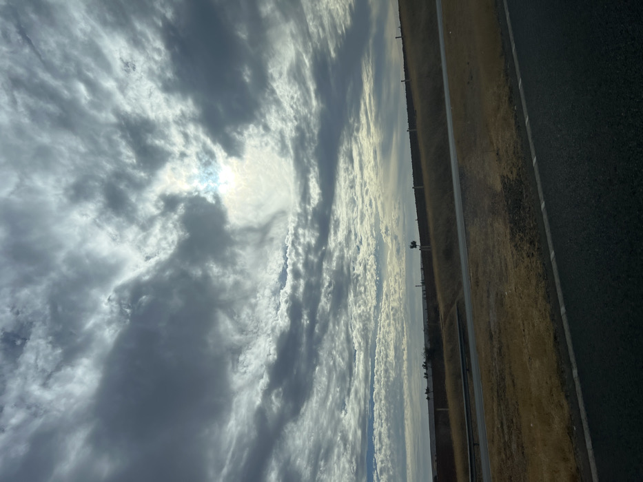 The image displays a rural landscape near Ain Chkef, Morocco, under a predominantly overcast sky. The upper two-thirds of the frame are filled with a dense, textured arrangement of grey and white stratocumulus clouds, with a bright, diffused light source, presumably the sun, visible through a break in the clouds in the upper right, casting a luminous blue-white glow. The lower third of the scene comprises dry, yellowish-brown ground vegetation, indicative of arid terrain. A dark asphalt road surface occupies the immediate foreground, with a faint white line partially visible along its right edge. A silver metal guardrail extends horizontally across the mid-ground, delineating the road from a slightly elevated, gently sloping embankment. Behind the guardrail, a sparse row of small, dark trees or shrubs is scattered, with a single prominent specimen situated near the center-left. A fence line, characterized by dark vertical posts, runs horizontally across the background behind the vegetation. No human figures, animals, or additional vehicles are present in the visible area. The scene is static, captured under diffuse yet intermittently bright natural lighting.