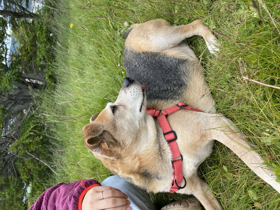 - "A tan and gray dog wearing a red harness lies on its back in green grass, tongue slightly protruding" by FM-vptCs2, licensed under CC BY 4.0