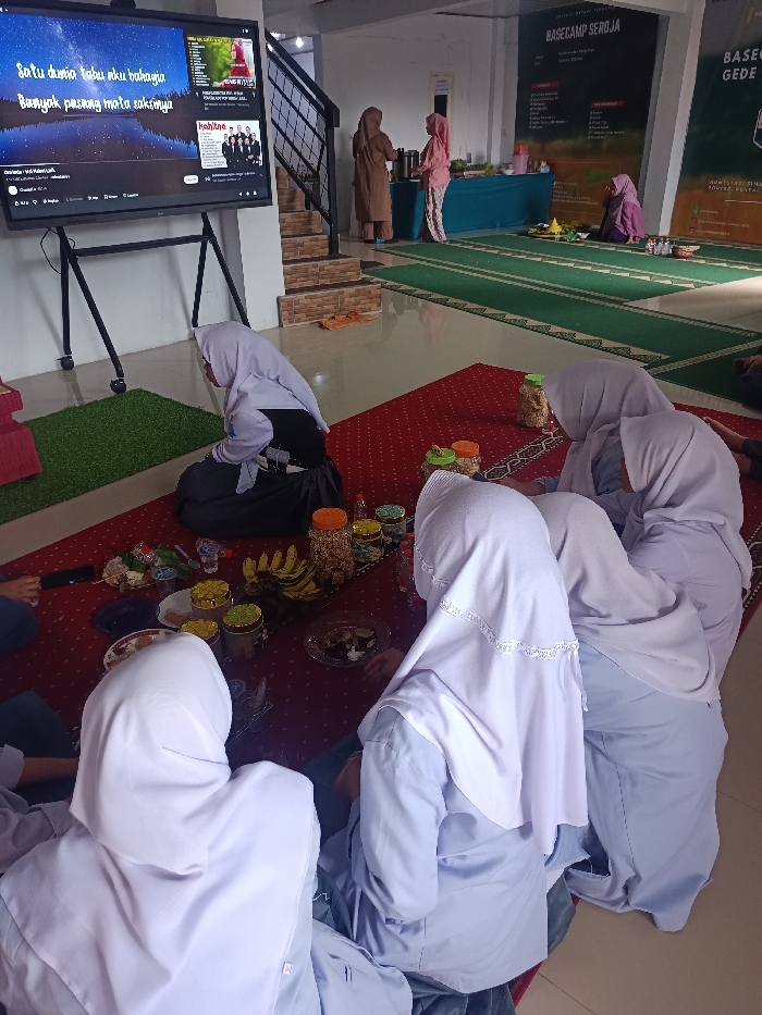 A gathering of several young women wearing hijabs, sitting on a red rug indoors. They are gathered around a spread of food and snacks. A television screen displays a lyric video with the text, "Satu dunia tabu nku bahagia, Banyak pasang mata saksinya." In the background, individuals are seen near a serving area, and a green carpet with stripes is visible. A sign reads "BASECAMP SEROJA" and "BASE GEGE."