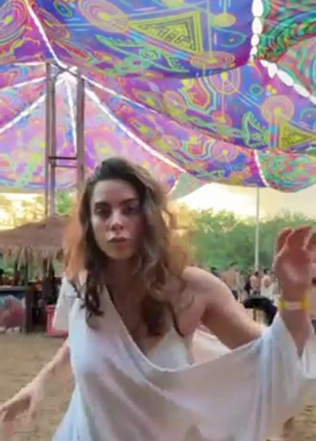A woman with curly hair, wearing a white top, is dancing at what appears to be a music festival. Behind her, other people are also dancing and walking around. Above the crowd is a large, colorful canopy featuring psychedelic patterns. In the foreground, a person gives a thumbs up while recording the video. The ground is sandy and the general atmosphere seems relaxed and festive.