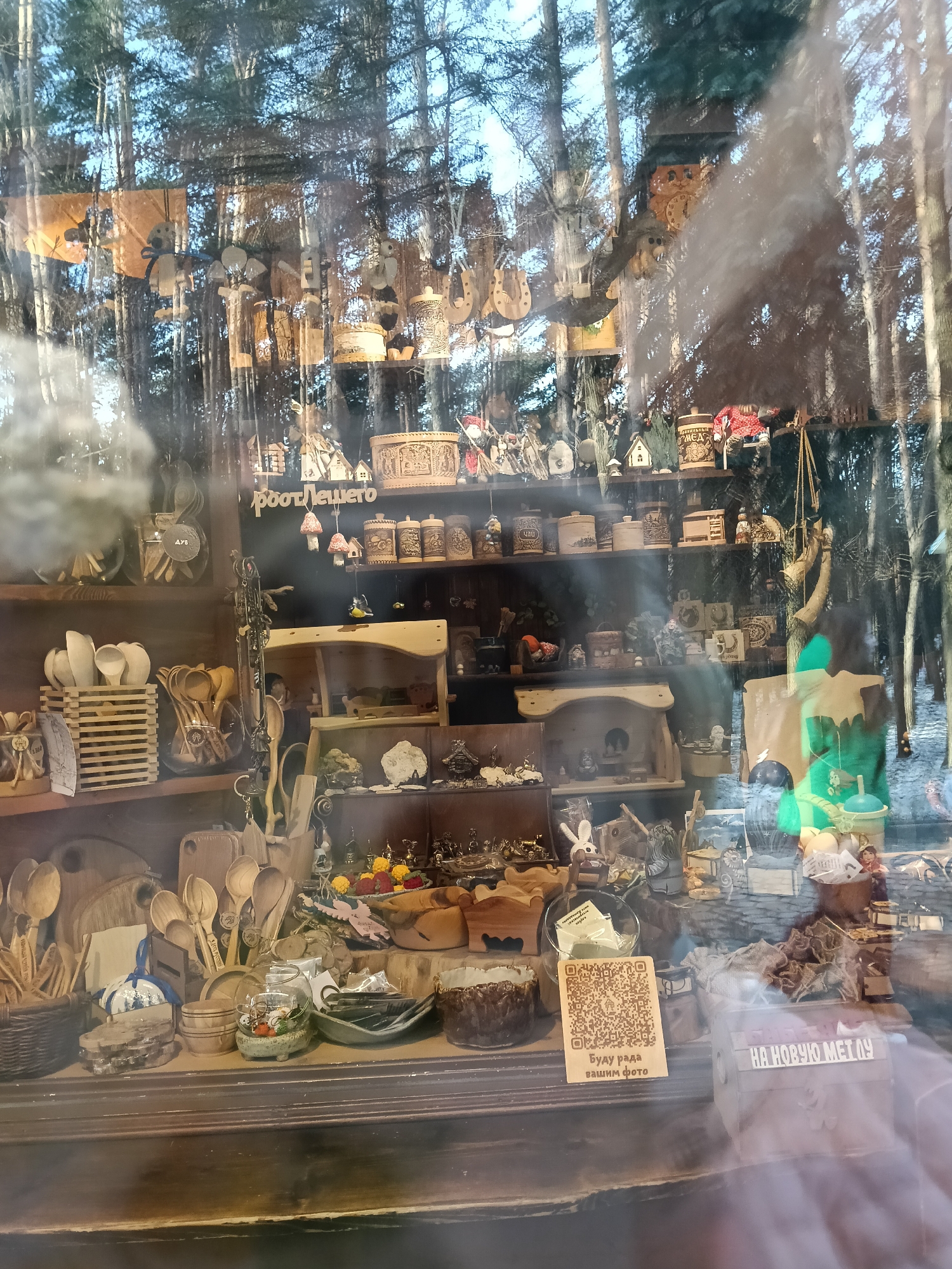The image displays the interior of a craft and souvenir shop in Domodedovo, Russia, viewed through a highly reflective glass window. The reflections superimpose a dense forest scene with tall, slender trees and a light blue sky over the shop's merchandise. Patches of snow or light-colored ground are visible within the reflected forest in the lower right. Inside the shop, multiple wooden shelves are densely packed with various items, predominantly handcrafted wooden objects. Prominently displayed are numerous wooden spoons, ladles, and spatulas, some arranged in slatted wooden crates or clear glass containers. Birch bark containers, cylindrical and rectangular, with carved designs are present, some labeled "ЧАЙ" (tea) and "МЕД" (honey). Other items include small wooden miniature houses, carved animal figures (such as a white rabbit figurine on a lower shelf), decorative wooden ornaments (some resembling mushrooms or birds), cutting boards, small woven baskets, and ceramic bowls. A black sign on an upper shelf reads "роотлешего". On a lower shelf, a wooden plaque displays a QR code accompanied by the text "Буду рада вашим фото" (I will be glad for your photos). Adjacent to this plaque is a transparent box labeled "НА НОВУЮ МЕТЛУ" (For a new broom). No individuals are visible in the scene.