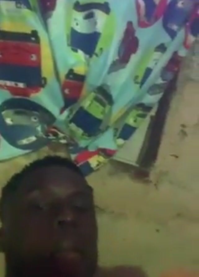 A person is lying down, looking up at the camera. They are holding a small, orange, round object in their hand. Above them is a curtain or tapestry with images of cartoon vehicles. The room appears to be poorly lit, with visible wall imperfections.
