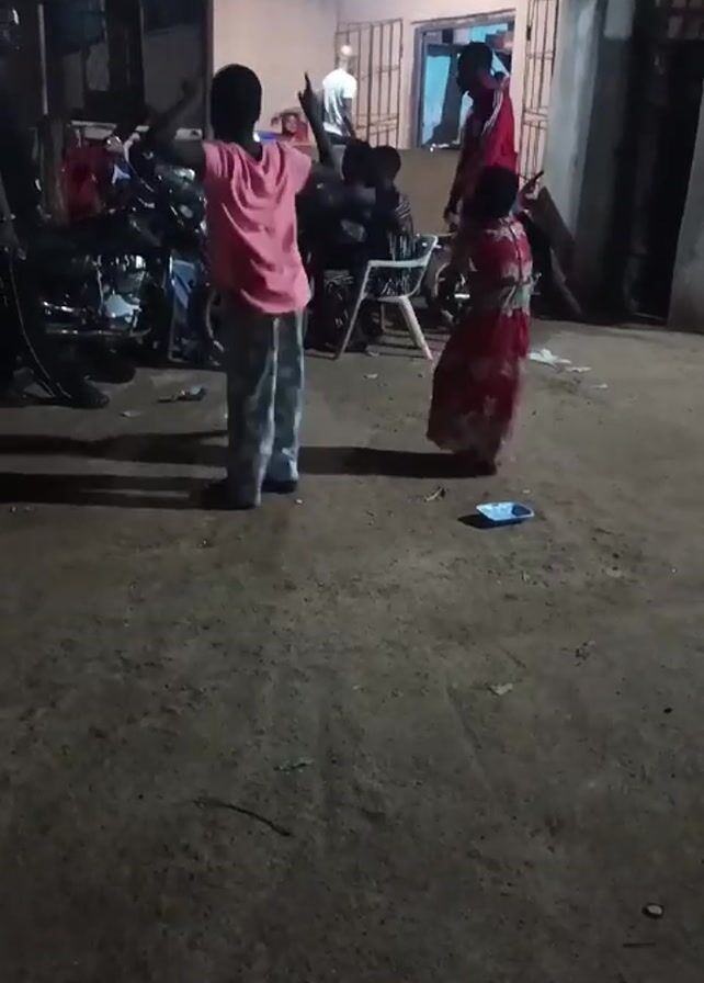 dimly lit outdoor gathering at night, with two children, one in a pink shirt and patterned pants and the other in a red dress, dancing in the foreground. Behind them, a group of people sit and stand near a building, some appearing to watch the children. A motorcycle is parked on the left side of the frame. Debris litters the ground.
