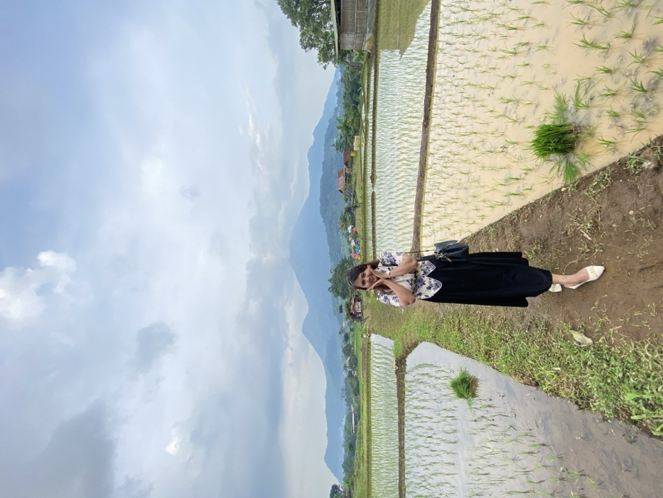 An outdoor, eye-level full shot depicts an adult female standing on an unpaved earthen path amidst flooded rice paddies in Selotapak, Indonesia