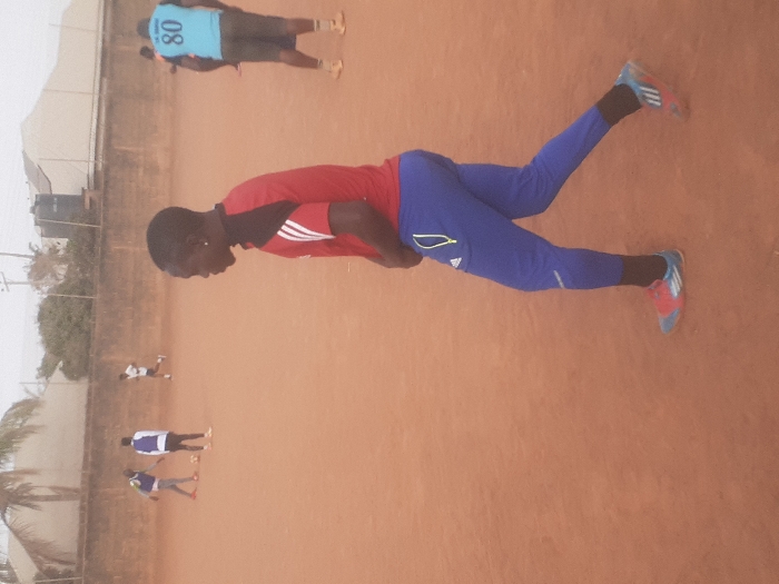 A red-shirted man is captured mid-action, possibly exercising, on a clay-like surface. He wears blue pants and colorful running shoes. Other people are visible in the background, some in blue and white athletic wear, suggesting a group training session. A chain-link fence, greenery, and a tall water tank form the background. The lighting appears to be natural, possibly during daytime, with some cloud cover or haze contributing to the soft illumination.