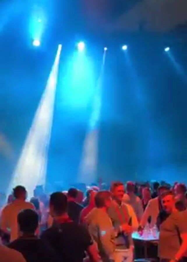 crowded indoor space with people standing and socializing under bright, colorful lights. There are spotlights shining down on the crowd, and a disco ball is visible in the ceiling. People are facing the camera in different directions, some talking and some standing by tables. The general atmosphere suggests a party or event.