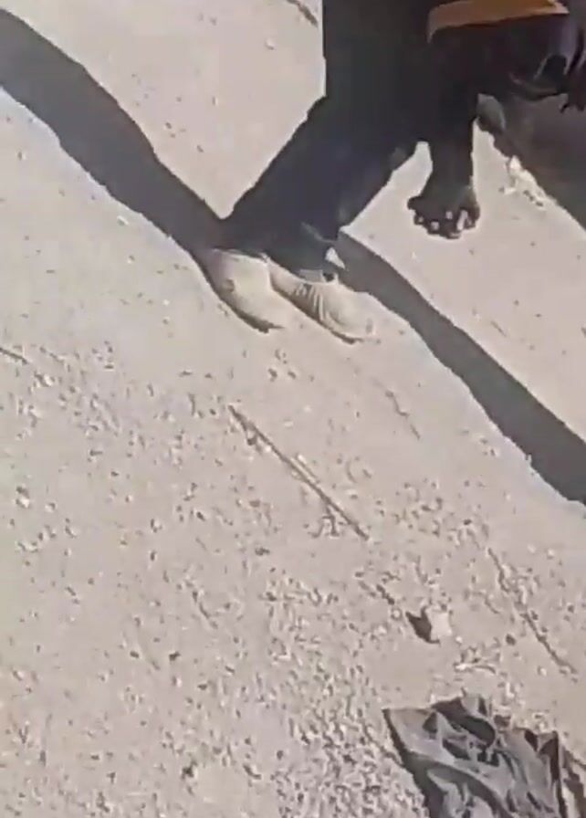 A young person is bending over, a black bucket on their back, scooping something up with their hands from the ground. Another person, wearing a black head covering and a blue dress, is approaching, smiling. The person in the dress then takes the bucket from the first person. The scene appears to be outdoors in a residential area.