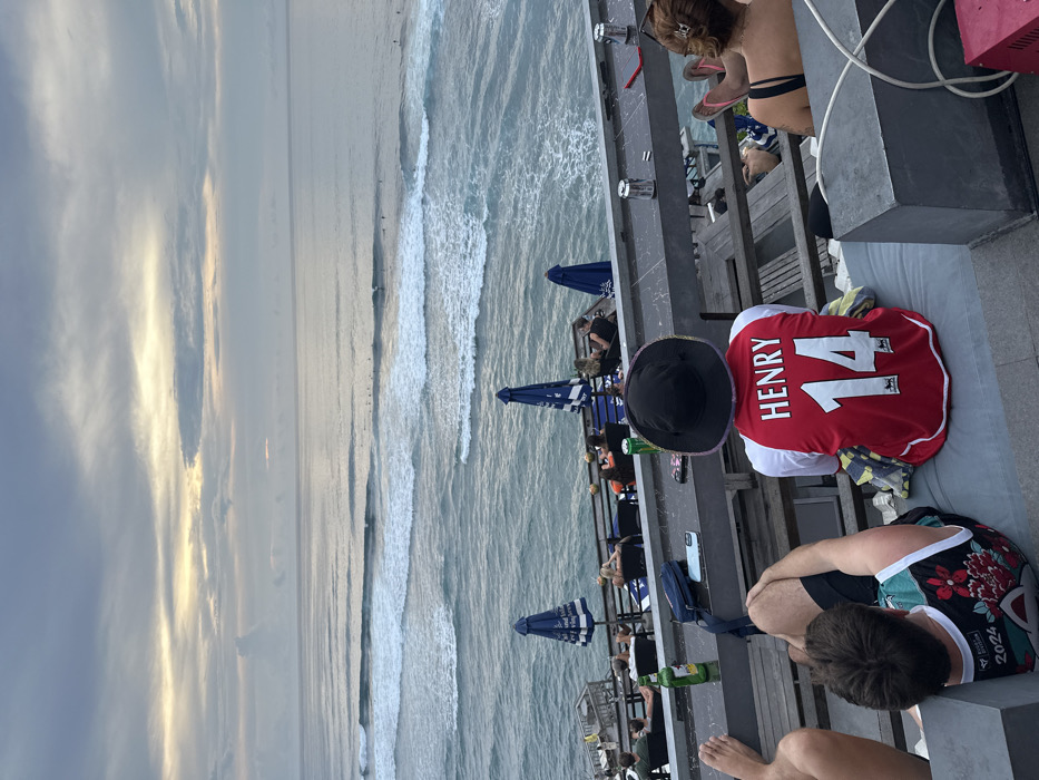 The image depicts an outdoor, multi-level terraced bar or restaurant overlooking the ocean in Uluwatu, Indonesia, during overcast conditions with a soft, yellowish light near the horizon. In the foreground, four individuals are partially visible, seated on a gray concrete bench facing the ocean. From left, bare legs and feet are visible. Next, a person with dark hair wears a white, black, and red patterned tank top. Central to the frame, a person wears a black bucket hat and a red football jersey with "HENRY" and the number "14" on the back. To the right, a person with light brown hair and pink flip-flops is partially obscured by a concrete barrier. A dark gray counter runs horizontally across the mid-ground. Upon it, from left to right, are a green beer bottle, a blue pouch, a light blue smartphone, a dark-colored smartphone in a patterned case, two silver beverage cans, and a red smartphone. Below this counter, a wooden railing is visible. Further down, on a lower deck or terrace closer to the ocean, approximately eight to ten individuals are seated at tables or on lounges, also facing the water. Several blue umbrellas are open. Objects resembling coconuts are visible on some tables. This lower deck features wooden structures and railings. In the background, the vast ocean extends to the horizon. Numerous white-capped waves are present. Multiple small figures, identified as surfers, are scattered across the water, either paddling, waiting for waves, or riding them. The sky is predominantly overcast with dark and light gray clouds, with a thin band of subdued yellowish-orange light visible above the ocean horizon.