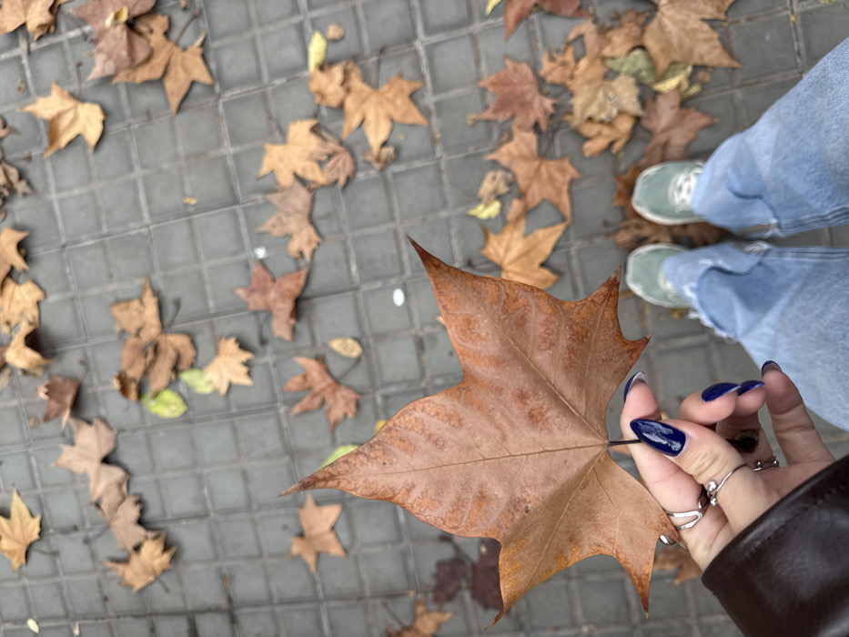 The image displays a close-up, top-down perspective of a person standing on a tiled sidewalk in Barcelona, Spain. A left hand, adorned with dark blue polished fingernails and multiple silver rings, holds a single large, dry, five-lobed plane tree leaf. The individual wears a dark brown sleeve, light blue distressed denim jeans, and light green athletic shoes. The grey square-tiled pavement beneath is extensively covered with scattered dry brown plane tree leaves and a few smaller green leaves, indicating an autumn season urban environment.