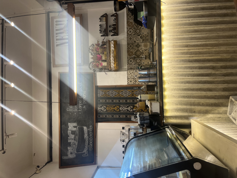 The image depicts the interior of a cafe or coffee shop located in Kerambitan, Indonesia, characterized by a static scene with no discernible human presence or action