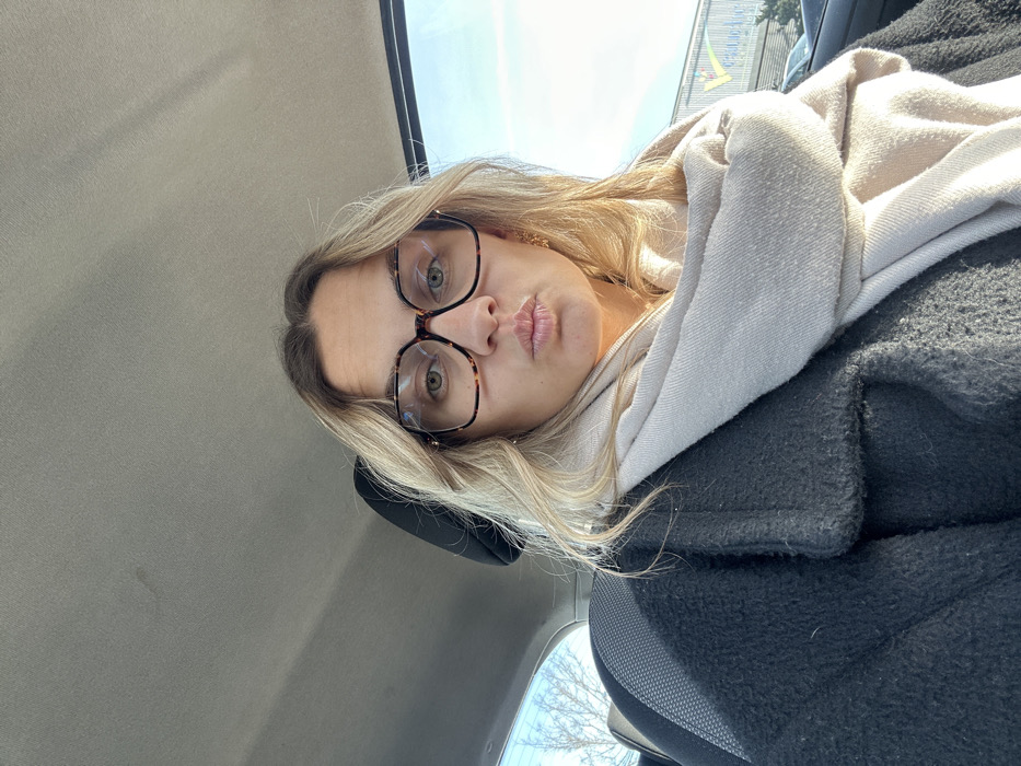 A female individual is seated in the passenger side of a vehicle, captured in a chest-up selfie