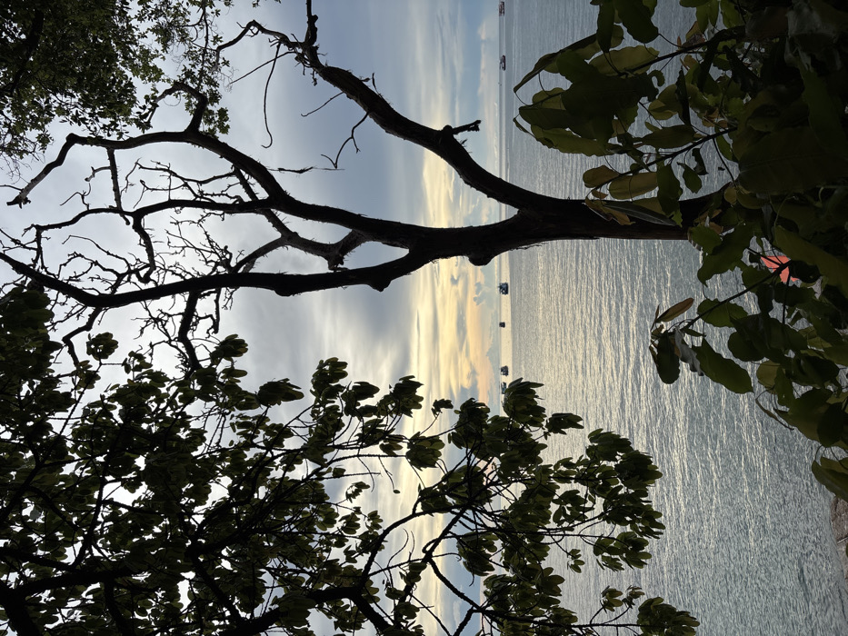 The image depicts a coastal scene in Tambon Ko Tao, Thailand, at either dawn or dusk. The foreground is dominated by silhouetted tree foliage. A dense, leafy tree branch is positioned on the left, partially obscuring the view of the sea. To the right, a darker, gnarled tree with mostly bare branches stands vertically, extending from the bottom towards the upper right. Sparse, darker green leaves are visible on branches in the lower right. The midground features a calm body of water, likely the Gulf of Thailand, reflecting the subdued light of the sky. Scattered across the water are at least seven discernible boats, appearing as dark silhouettes against the horizon. They exhibit various shapes, suggesting different types of vessels, possibly dive or fishing boats, and appear to be stationary or moving slowly. A small, indistinct orange object is partially visible within the lower right foliage, near the water. The background is an overcast sky with a horizontal band of muted yellow and orange hues near the horizon, indicative of twilight. This transitions to grayer and bluish tones in the upper sky, with visible cloud formations. No individuals are present in the frame. The overall scene conveys a serene, natural coastal environment.