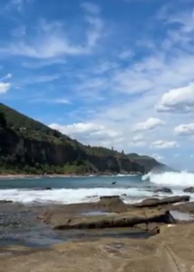rocky coastline with waves crashing against the shore. A steep, green hill rises from the coast, topped with trees and some buildings. The sky is blue with scattered white clouds. The foreground features large, flat rocks with pools of water. The ocean is a mix of turquoise and white where the waves break. There is a person in the water riding a wave in the distance.