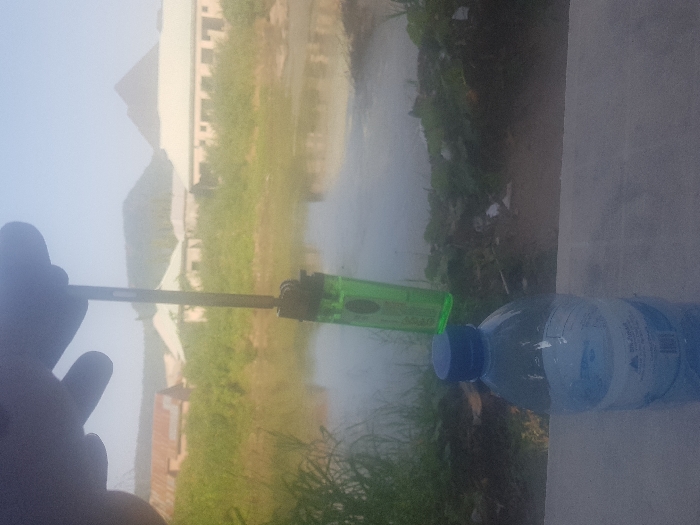 A first-person perspective photograph taken in Adankolo, Nigeria, depicts a human hand holding a dark, slender tool, possibly a screwdriver, in the upper portion of the frame. This tool vertically suspends a transparent green plastic lighter, positioned directly above a partially filled clear plastic water bottle with a blue cap. The bottle rests on a light grey concrete surface in the immediate foreground. In the midground, a body of calm water, likely a pond or stream, is visible, reflecting the ambient light. Its banks are lined with dense green vegetation, and scattered debris is present on the far side. The background features several residential-style buildings with varied roof materials, including corrugated reddish-brown and lighter-colored flat or low-pitched roofs. Beyond these structures, green hills or mountains rise under a bright, clear sky. No other individuals are present in the scene.