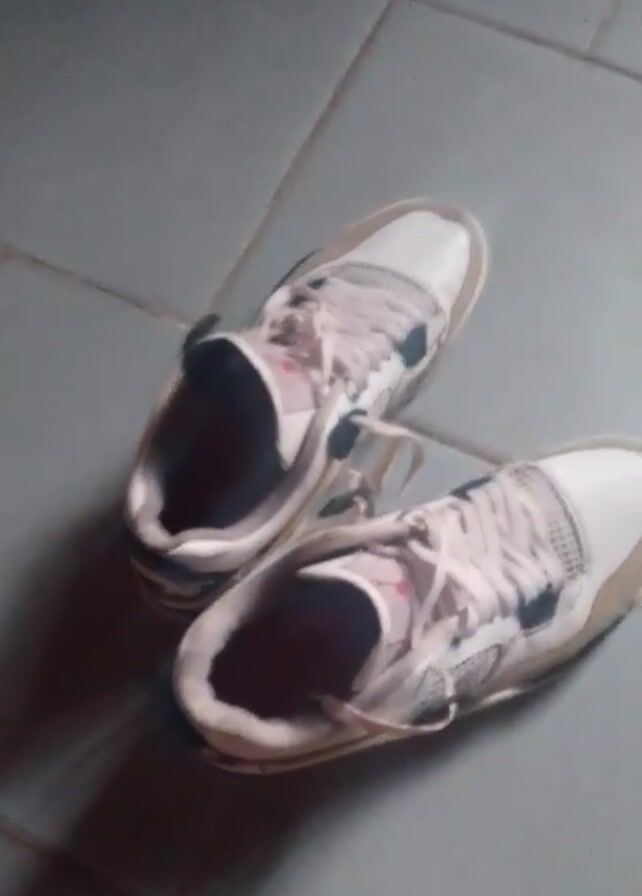 pair of white Air Jordan sneakers resting on a gray tiled floor. A hand reaches into the frame and picks up one of the sneakers, turning it to show the side view.