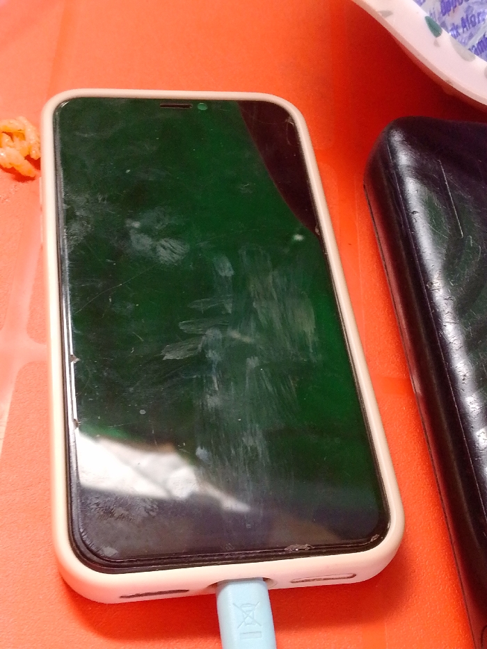 A smartphone, vertically oriented and encased in a light-colored protective cover, rests on a reddish-orange surface. Its screen is dark, highly smudged with fingerprints and smudges, and exhibits multiple minor scratches. A light blue USB-C charging cable, bearing a crossed-out trash bin symbol on its connector, is plugged into the phone's bottom port. To the immediate right of the smartphone is a dark, rectangular object with a worn, textured surface. A small cluster of light orange, granular material is visible to the upper left of the phone. Partially visible in the upper right quadrant is a white object, possibly a piece of paper or a disposable plate, with faint blue text or graphics. The overall lighting appears dim, casting reflections on the phone's display.