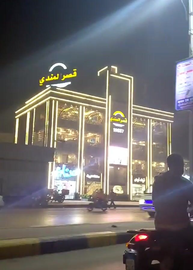 - "At night, the camera on a motorcycle captures a roadside view of a brightly lit building identified as "Qasr Al Mandi" with its Arabic script and the number "19837"" by FM-ttalh2, licensed under CC BY 4.0