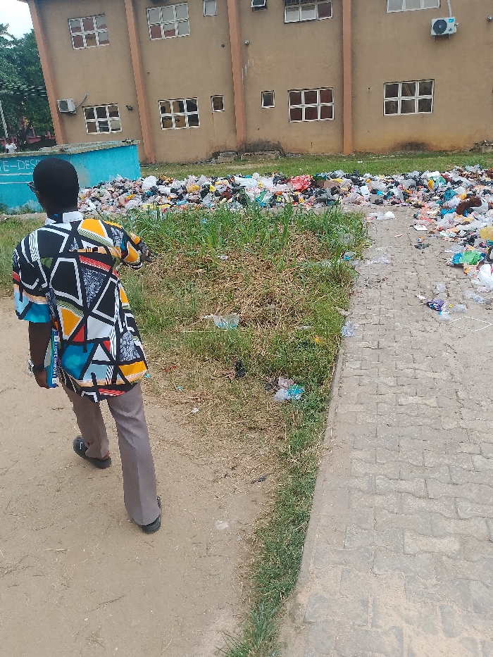 An outdoor scene in Rumuekini, Nigeria, shows an individual walking on a dirt path adjacent to a large accumulation of refuse