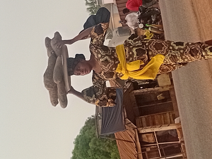 A woman, head-dressed, wears a patterned brown and gold top cinched with a yellow sash. She balances a wooden plank atop her head, carrying large, oblong, root vegetables. In the background, blurred figures stand near a table or counter with items on it. The setting appears to be an outdoor market or street scene.