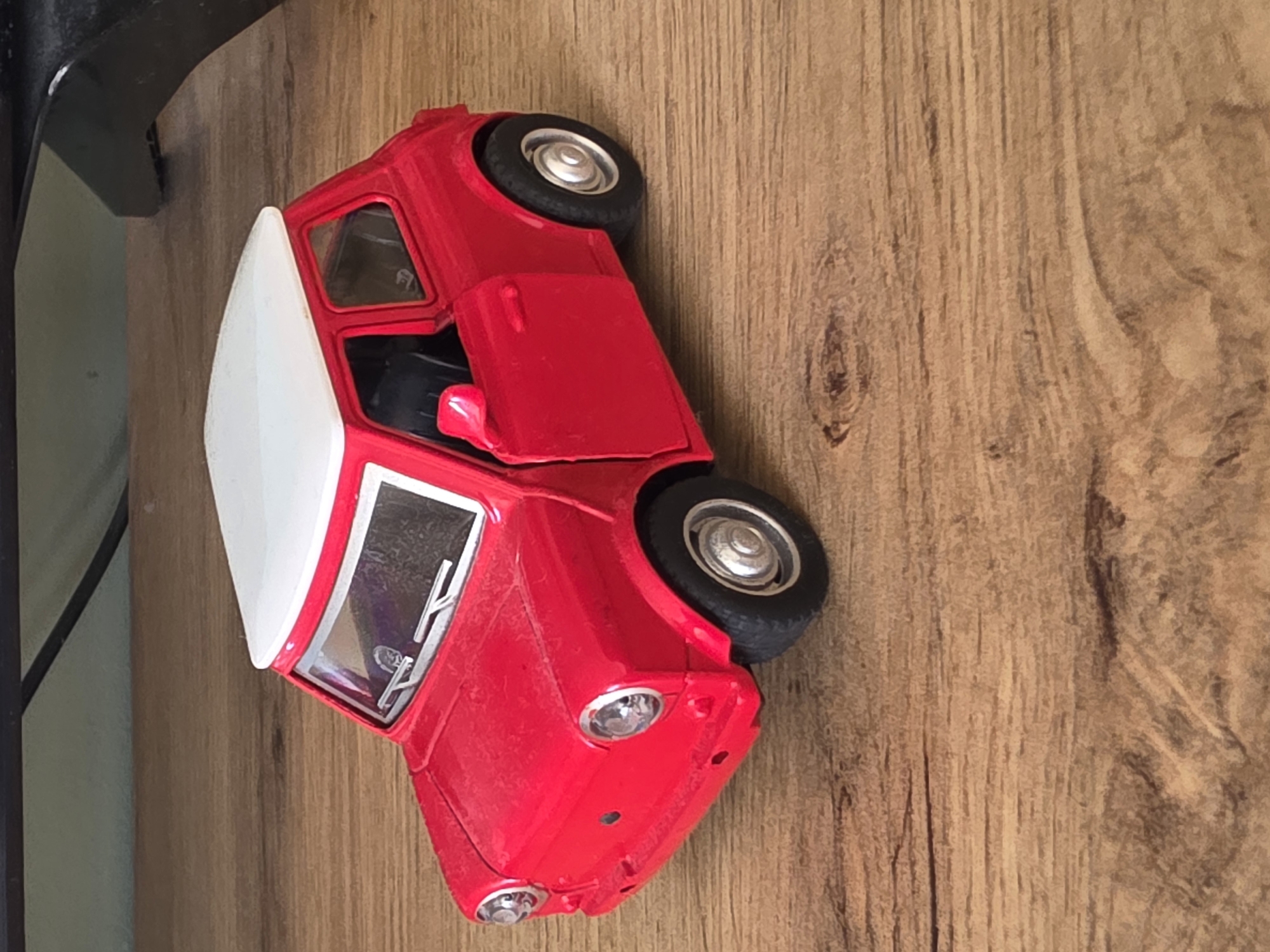- "The scene depicts a miniature red car with a white roof positioned on a light brown wooden surface" by FM-tqQCN2, licensed under CC BY 4.0
