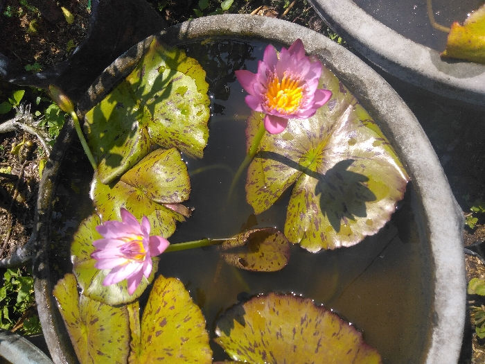 In Siquisique, Venezuela, a top-down perspective captures a weathered concrete pot containing water, two blooming water lilies, and multiple lily pads. The lilies present with pink-purple petals and distinct yellow centers. One flower is erect on its stem, while the other lies closer to the water. An unopened lily bud is situated in the upper right. Lily pads, exhibiting green and reddish-brown coloration with mottled patterns, float on the water's surface. Direct sunlight is evident, casting a clear shadow of one lily onto a leaf. A second, similar concrete pot is partially visible on the right. The background features green vegetation and exposed soil, consistent with an outdoor garden environment.