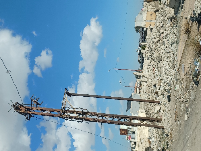 The scene depicts a landscape of extensive urban destruction in Al-Qadam Municipality, Syria, under a clear blue sky with scattered white clouds. A prominent, heavily rusted metal utility pole, equipped with multiple cross-arms, insulators, and overhead electrical wires, stands in the left-center foreground. A second, thinner dark pole supports a section of the main structure to its right. The immediate ground level consists of dirt, gravel, dry sparse vegetation, and scattered debris including plastic refuse. The midground is dominated by large, irregular mounds of pulverized concrete, broken bricks, rebar, and general construction debris, indicating the complete destruction of numerous buildings. Partial standing walls and skeletal remnants of structures are visible amidst and behind these rubble piles, particularly on the right side. In the background, beyond the immediate devastation, several partially intact or reconstructed buildings are visible, one featuring solar panels on its roof. Two street light poles with white fixtures are also present in the middle distance. There are no individuals, vehicles, or discernible actions occurring within the visible frame. A partially obscured sign with Arabic script is affixed to a building in the distant left.