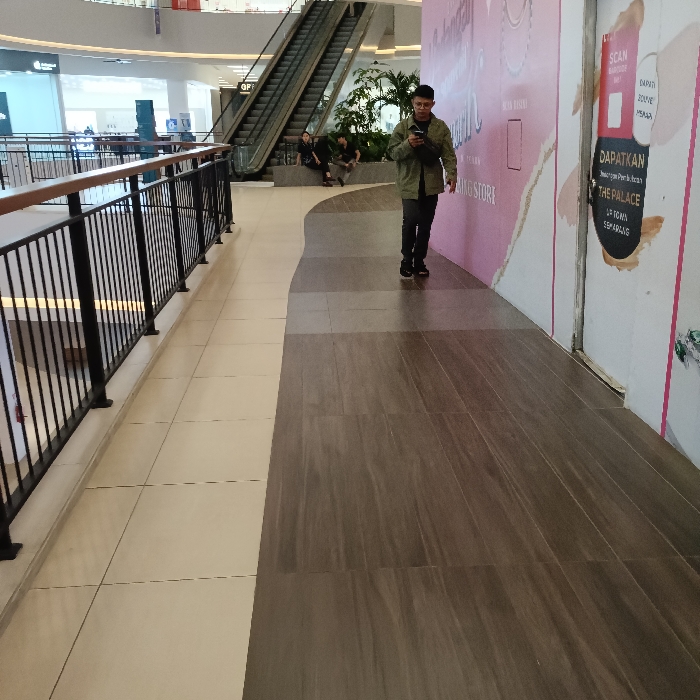 The image depicts a hallway in a modern shopping mall located in Kecamatan Mijen, Indonesia, at the coordinates -7.045, 110.325. The hallway is lined with white tile on one side, transitioning to dark brown tile on the other. A man in a green jacket and black pants walks along the brown tile section, looking down at his phone. The hallway is partially obstructed by a black metal railing and a white door on the right side. An escalator is visible in the background, leading upwards to the next floor. The hallway is well-lit, and there are no other people in the scene. There is a plant in a pot in the background. The wall on the right is partially covered with pink and white signage. The floor is mostly tiled.