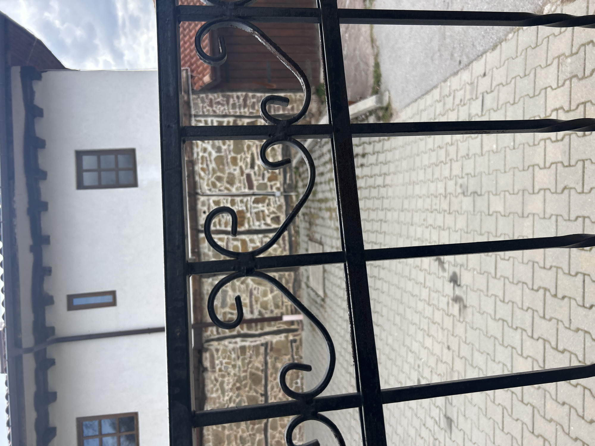 The image depicts an exterior scene in Gigintsi, Bulgaria, viewed through a wrought iron gate