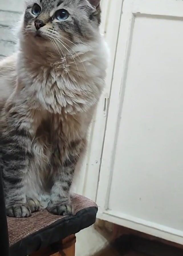 - "medium-haired cat with blue eyes standing on a wooden chair" by FM-pJyc73, licensed under CC BY 4.0