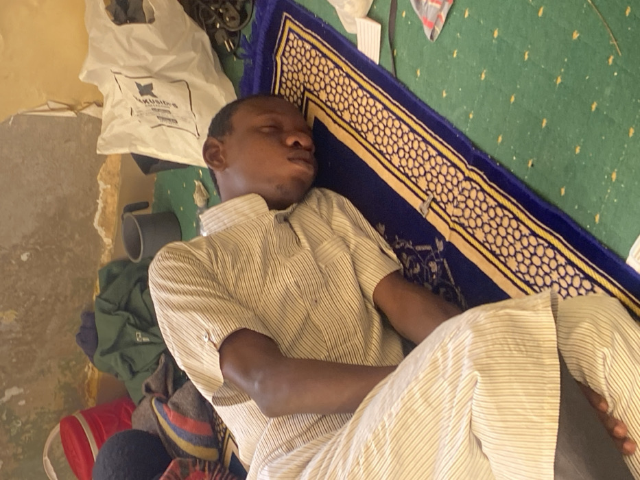 An adult male is observed lying on his right side with his eyes closed, resting on a blue prayer mat with gold-patterned borders, which is placed over a green carpet. He is dressed in a light-colored, striped, collared shirt with rolled sleeves and matching striped trousers. The scene is indoors in Katcha, Nigeria. The wall behind him is light-colored and shows signs of wear and peeling. Surrounding objects include a red plastic container, a dark crumpled garment, a grey plastic mug, a white plastic bag bearing "MUSLIMS" text, and dark cables. A multicolored striped blanket is partially visible to the left of the subject.