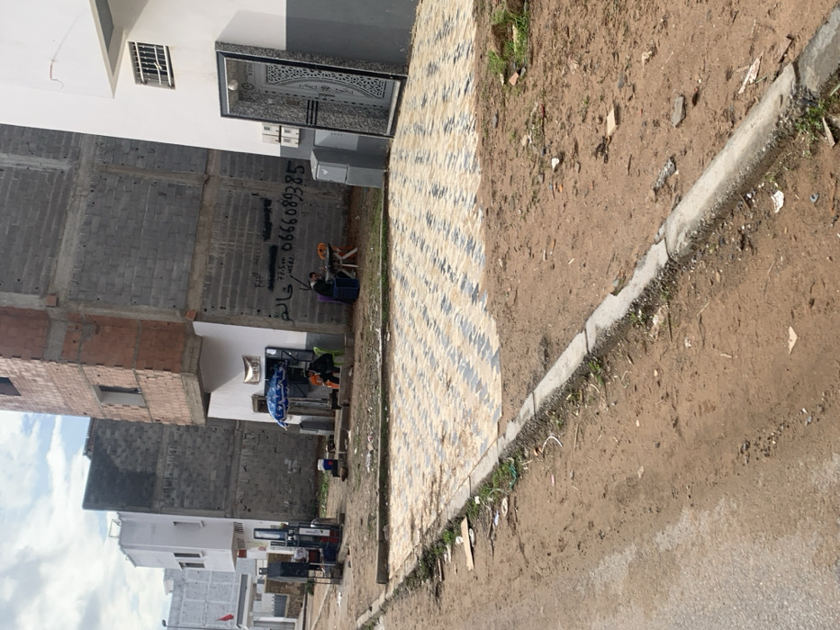This image depicts a street scene in Ameur عامر, Morocco, under an overcast sky. The foreground features a dirt road with a damaged concrete curb separating it from an unkempt dirt shoulder containing scattered debris. Beyond the curb, a paved area with light and dark grey diagonally striped pavers extends towards three multi-story buildings. From left to right, the buildings are: 1. A partial view of a white, finished structure with a visible Moroccan flag pole and a red flag. Adjacent to this, two red and grey fuel pumps are present. 2. A partially constructed building, featuring a finished white ground floor with a dark blue awning and a blue-and-white striped umbrella. This area functions as an outdoor seating space, where two individuals are seated at a small table. One individual wears a dark top, the other an orange-brown top. The upper floors of this building consist of exposed grey concrete blocks and reddish-brown bricks with rebar visible, indicating ongoing or incomplete construction. Graffiti, including Arabic text and a phone number (0666089385), is present on the grey concrete wall. Further to the right of the umbrella, a third individual in a dark jacket sits at a small orange table with a white plastic chair, engaged with an object on the table. A dark blue container sits next to this individual. 3. A finished white building with a grey base. A large, ornate, dark-colored metal door frame leans against the white wall. A window with metal security bars is visible on an upper floor. The overall environment suggests a mix of residential and small-scale commercial activity, with construction in progress or stalled in the vicinity.