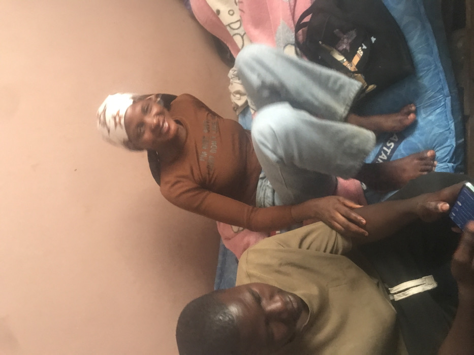 A woman in a brown shirt and headscarf smiles at the camera while sitting on a bed with light blue sheets and a pink blanket. She is wearing gray pants. A black bag sits next to her. A man wearing a tan shirt and black pants sits in front of her, holding a smartphone. The scene appears to be indoors, with a light pink wall in the background.