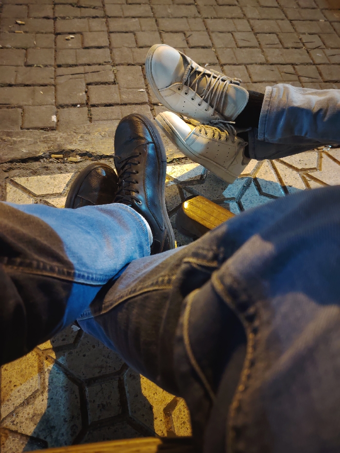 The image displays a low-angle, first-person perspective of two individuals' lower legs and feet on a paved outdoor surface at night in an urban area of Tangier, Morocco. The foreground reveals the legs of one person wearing dark blue denim jeans and black lace-up boots. The other individual's legs and feet are centrally positioned, clad in light blue denim jeans, black socks, and light-colored (off-white) athletic shoes with laces. The foot of the individual in athletic shoes is positioned above the leg of the person wearing black boots, suggesting a relaxed, crossed-leg posture or similar interaction. The ground is constructed from interlocking rectangular and hexagonal concrete paving blocks. The scene is illuminated by an artificial, warm-toned light source, casting distinct shadows on the pavement. A small, light-colored object consistent with a cigarette butt is visible on the pavement in the upper left. A ridged, elongated object, possibly metallic or wooden, is partially visible on the ground between the feet.