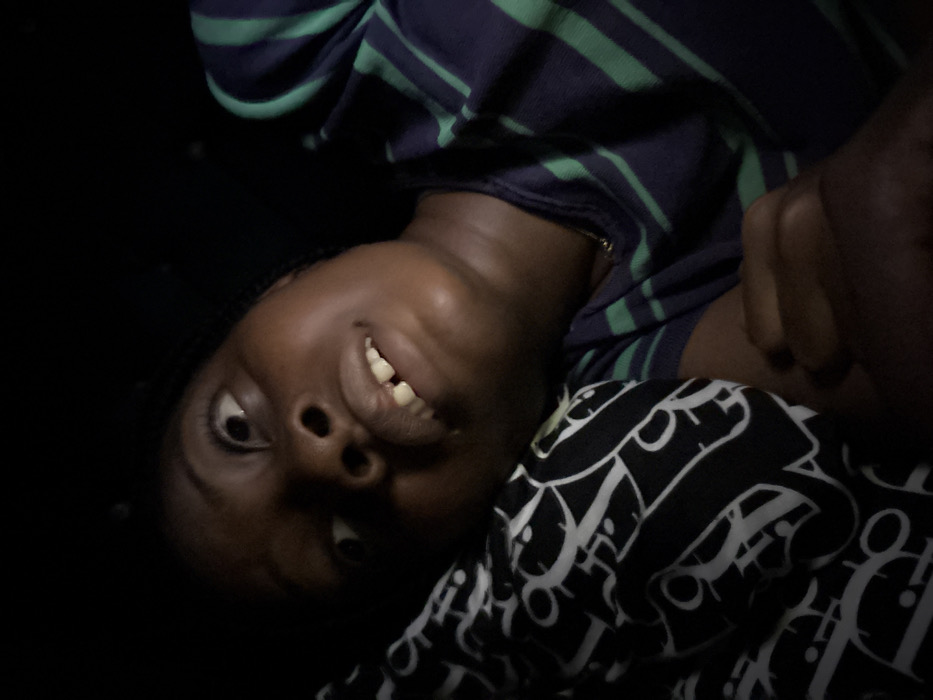 A dark-skinned person smiles toward the camera. They wear a blue and green striped shirt. The lower part of the image shows a black and white patterned fabric. The face is tilted slightly to the right. The surrounding area is dark.