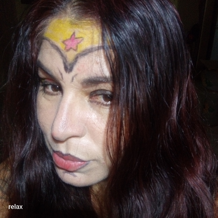A woman with dark hair and Wonder Woman makeup is looking at the camera. Her forehead is painted with a yellow W emblem, featuring a pink star inside. She has dark eyeliner and light pink lipstick with a dark outline. Her skin appears somewhat textured. The background is dark and indistinct, focusing the attention on the woman's face. A small "relax" watermark is present in the lower left corner.