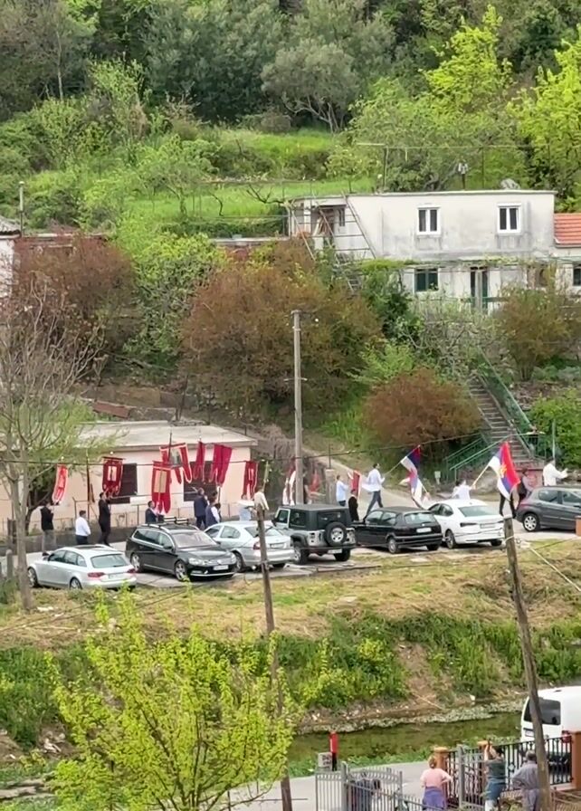 gathering of people in a small village setting. Multiple cars are parked near a cluster of buildings with flags displayed on their exteriors. The surrounding landscape consists of lush greenery, including trees and shrubs, and a small stream. The people are waving flags, some of which appear to be Serbian flags, suggesting a possible celebration or event with nationalistic undertones. The overall atmosphere seems festive or celebratory, with a sense of community gathering.