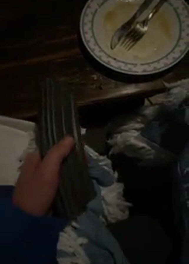 person holding an AR-15 style magazine. The person is wearing a blue sweatshirt and ripped jeans. There is a dirty plate with silverware on the table next to them. The lighting is poor. The person turns the magazine over in their hand to show both sides.