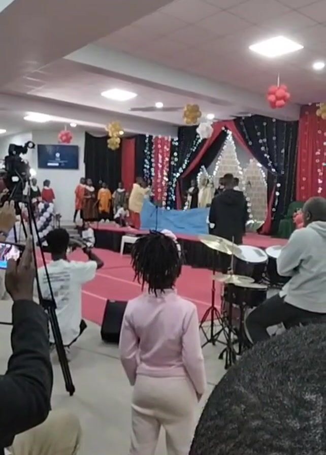 The interior of what appears to be a church or performance hall is shown in the video. In the foreground, a young girl with dreadlocks stands with her back to the camera. She is wearing a pink outfit. To her right, a man is seated behind a drum set. In the background, a stage is set up with a red carpet and decorated with black, red, and white curtains and ornaments. On the stage, a group of people dressed in various outfits are performing or preparing to perform. To the left, a cameraman is filming the scene with a professional camera on a tripod. Other people are also holding up their phones to record. The lighting is bright, and the overall atmosphere suggests a live event or performance.