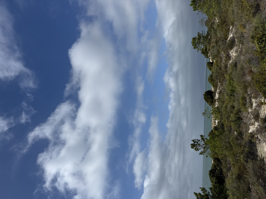 This image displays a coastal landscape in Grândola, Portugal, under a partially overcast sky. The upper portion of the sky features deep blue patches interspersed with bright white cumulus clouds, some wispy. Lower in the sky, a denser, more uniform layer of greyish-white stratocumulus clouds extends towards the horizon. In the midground, a choppy body of turquoise-green coastal water is visible, with faint, dark landforms discernible on the distant horizon. The foreground consists of uneven, sandy terrain consistent with dunes, densely covered by a variety of low-lying green and dark green scrub vegetation. Several mature pine trees are interspersed throughout this vegetation. No individuals, animals, or prominent man-made structures are present, and no actions or interactions are depicted.