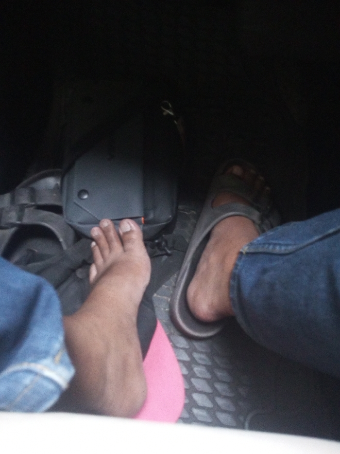The image captures a dimly lit interior, consistent with a vehicle's floor, described as being in Jabalpur, India