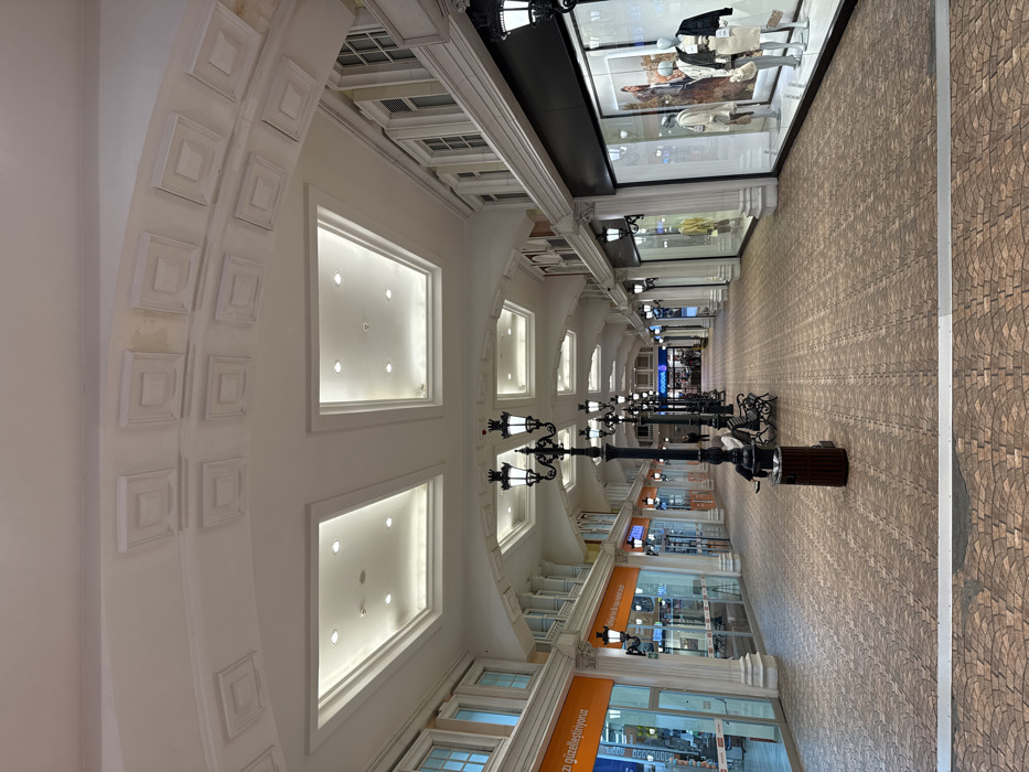 An indoor hallway is lined with store windows and punctuated by old-fashioned streetlights with benches
