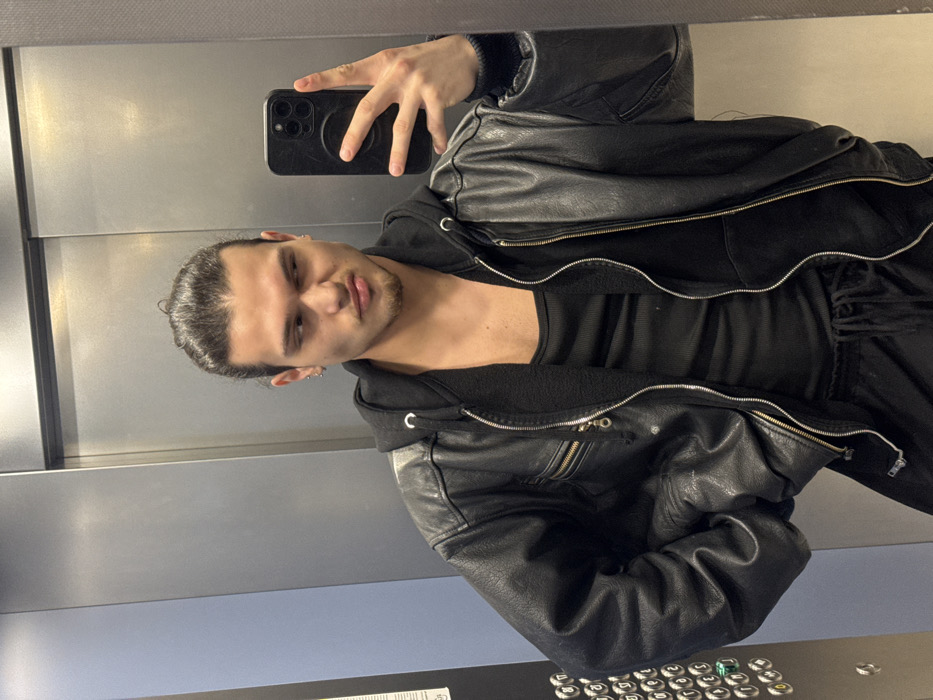 A young adult male with dark hair tied back and a short goatee is depicted in a mirror selfie taken within an elevator. He wears a black, unzipped leather-style jacket over a black, unzipped hooded sweatshirt, revealing a black ribbed tank top. His left hand holds a black smartphone with a visible pop-socket, capturing his reflection. His right hand is positioned near his hip or in his jacket pocket. The male displays a playful facial expression, with his lips pursed to the left and his gaze directed to the right. The elevator interior features brushed metal walls. An elevator control panel with a vertical array of illuminated green circular buttons is visible on the left side of the image. The scene is an elevator located in Sofia, Bulgaria.