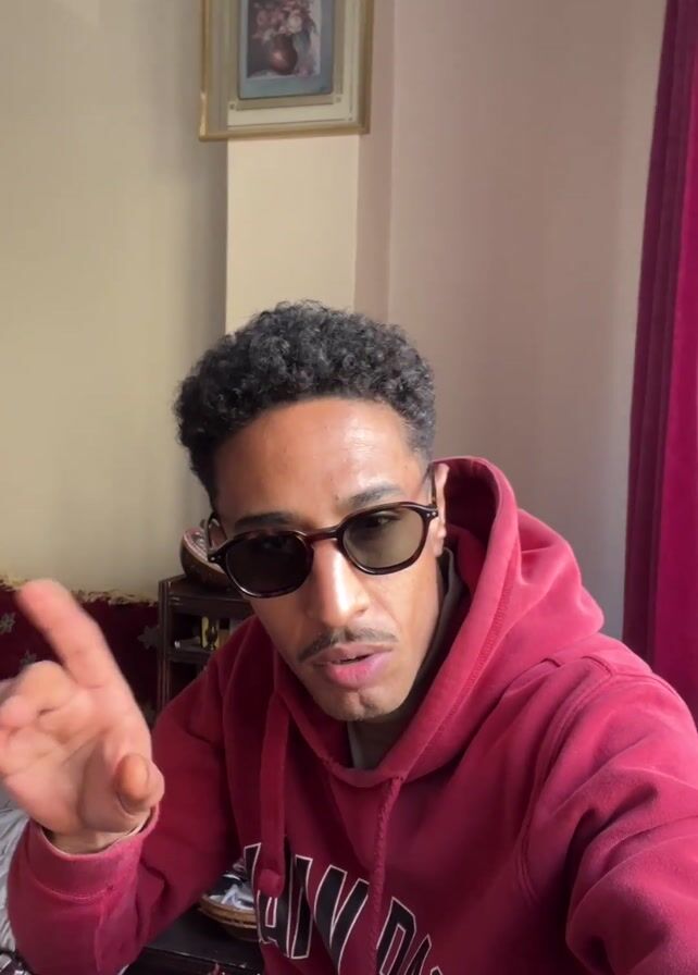 A man in his late 20s with short curly hair, sunglasses, and a mustache is speaking directly to the camera. He is wearing a red hoodie with lettering on the front. Behind him is a wall with a gold-framed painting hanging on it. To his left is a red patterned sofa and a dark wooden table. To his right, a dark red curtain hangs near a window. He gestures with his hand as he speaks.