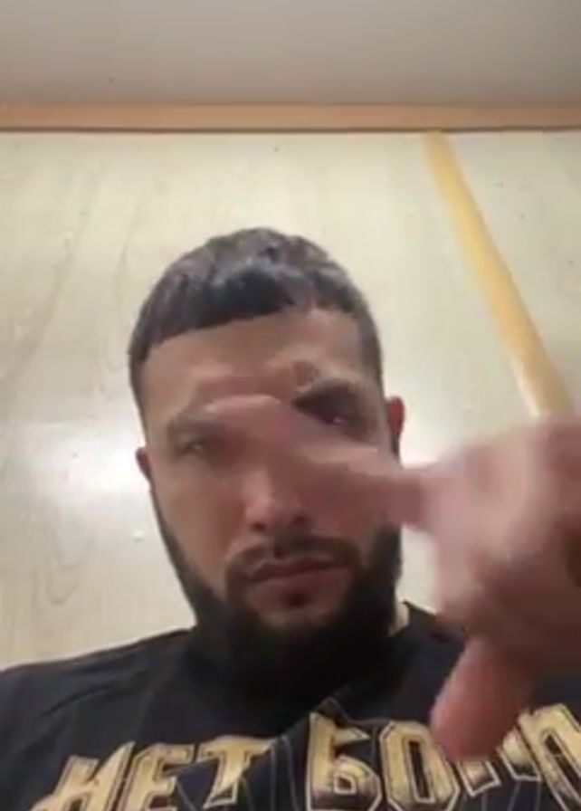 close-up view of a man with a beard, wearing a black t-shirt with a white and yellow design. He looks directly at the camera, initially with a serious expression, then points directly at the camera with his right hand. His expression changes to a smile after pointing. The background is a wall with a light wood-grain pattern and a light wood trim. Music plays in the background.