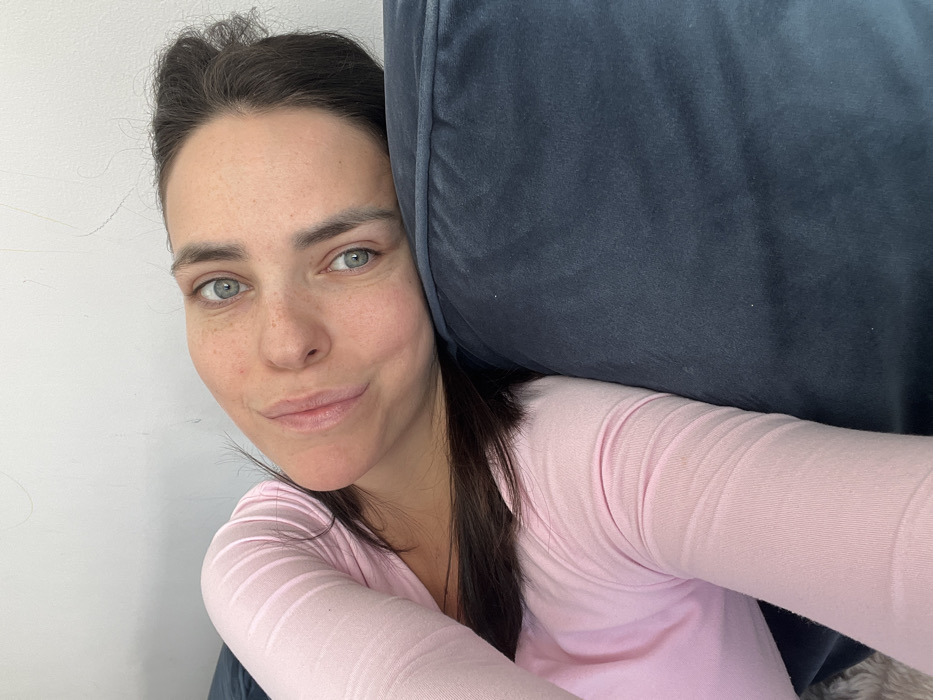 A single female individual is depicted in a close-up, indoor setting. Her head is tilted, resting on a dark blue or grey upholstered cushion, likely part of a sofa or couch. She has dark hair, which is partially visible, and light-colored eyes. Her skin appears fair with visible freckles on her face. She is wearing a light pink, long-sleeved top. The background consists of a plain white wall. The individual is looking directly towards the camera with a subtle smile. The specific location within the city of Budva, Montenegro, is not discernible from the visual information presented in the image.