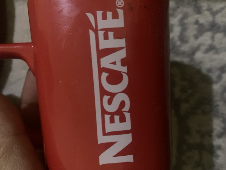 A close-up shot focuses on a red mug prominently displaying the white "NESCAFÉ" logo. The brand name is vertically oriented along the mug's body, with the handle visible on the left. A hand partially holds the mug. The background presents a blurred surface with a mottled gray and white pattern. The image has an informal, snapshot aesthetic.