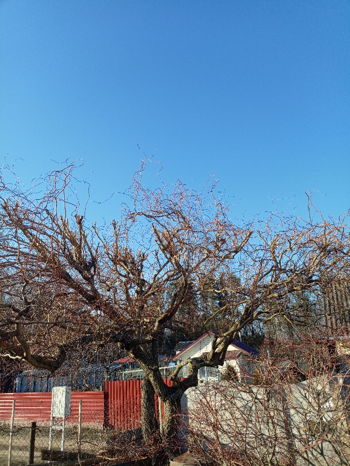 The image presents an outdoor residential scene in Гожскі сельскі Савет, Belarus, under a clear, vibrant blue sky. A large, deciduous tree with a dense network of bare, gnarled, reddish-brown branches occupies the central midground, its upper branches reaching into the sky. In the foreground, a low wire mesh fence is visible, behind which a red corrugated metal fence spans horizontally across the lower left and center. A white, rectangular utility box is affixed to a pole or structure positioned between the wire fence and the red corrugated fence. In the background, behind the primary tree and fencing, a white house with a reddish roof and prominent gables is partially visible to the right. Further behind, additional bare deciduous trees, some evergreen foliage, and indistinct residential structures, including a grey corrugated surface, are discernible. The scene is brightly illuminated by natural sunlight, suggesting a clear day in late winter or early spring. No individuals or animals are present.