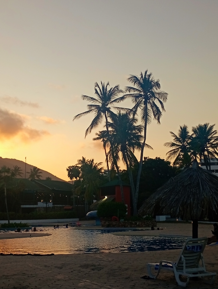 Palm trees silhouetted against a golden sky dominate the scene. A thatched umbrella and a white lounge chair sit on the sandy foreground. Beyond them, a swimming pool reflects the warm light, with people swimming within it. In the background, there are buildings and a tree-covered hillside.