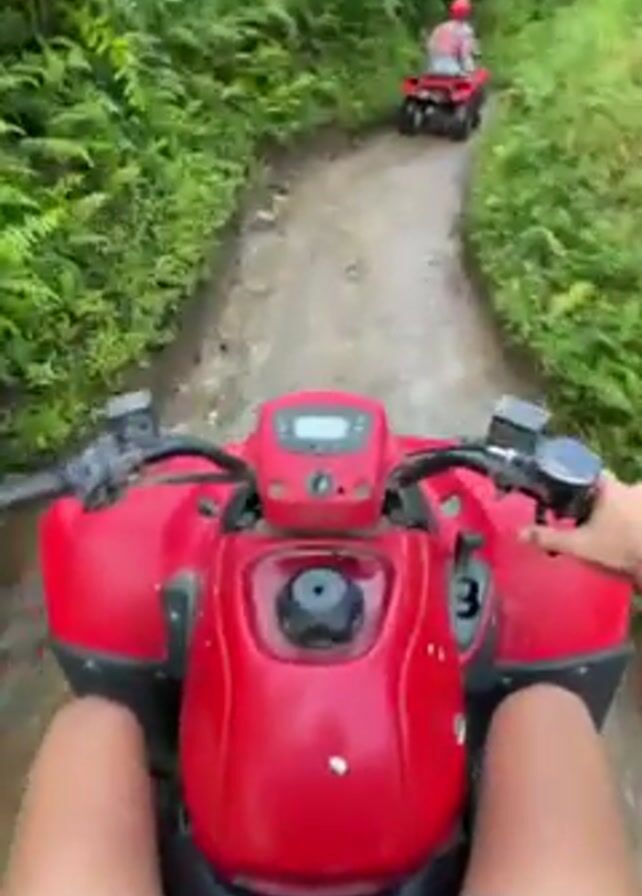 The video depicts a first-person point of view while riding a red ATV (All-Terrain Vehicle) on a dirt path