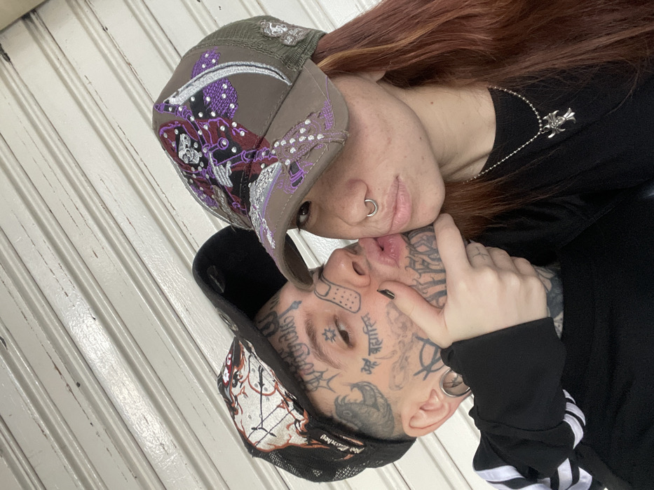 A couple poses closely, their faces touching. The woman has red hair, a nose ring, and a silver necklace. She wears a tan hat with purple and silver embellishments. The man has extensive face tattoos and a bandage near his eyebrow. He wears a black baseball cap with white stitching. They are indoors, standing in front of a wall with white vertical paneling. The woman's hand is visible near the man's face.